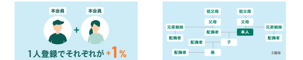 上記カードの本会員が家族のなかに一人いるとポイント還元率が1%上がります(最大+5%)